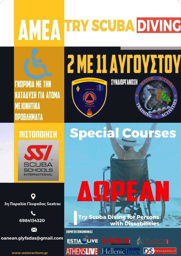 Τα μαθήματα κατάδυσης για άτομα με κινητικά προβλήματα( SCUBA DIVING COURSES for people with disabilities), θα πραγματοποιηθούν