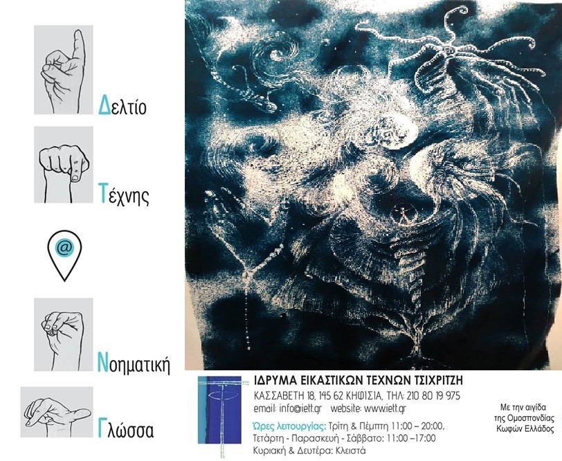 Το ΙΔΡΥΜΑ ΕΙΚΑΣΤΙΚΩΝ ΤΕΧΝΩΝ ΤΣΙΧΡΙΤΖΗ (Κασσαβέτη 18, Κηφισιά) εγκαινιάζει την Τετάρτη, 13 Φεβρουαρίου 2019 και ώρα 7:30μ.μ. έως 10:30μ.μ. την ομαδική εικαστική έκθεση με θέμα : Δελτίο Τέχνης στη Νοηματική Γλώσσα.